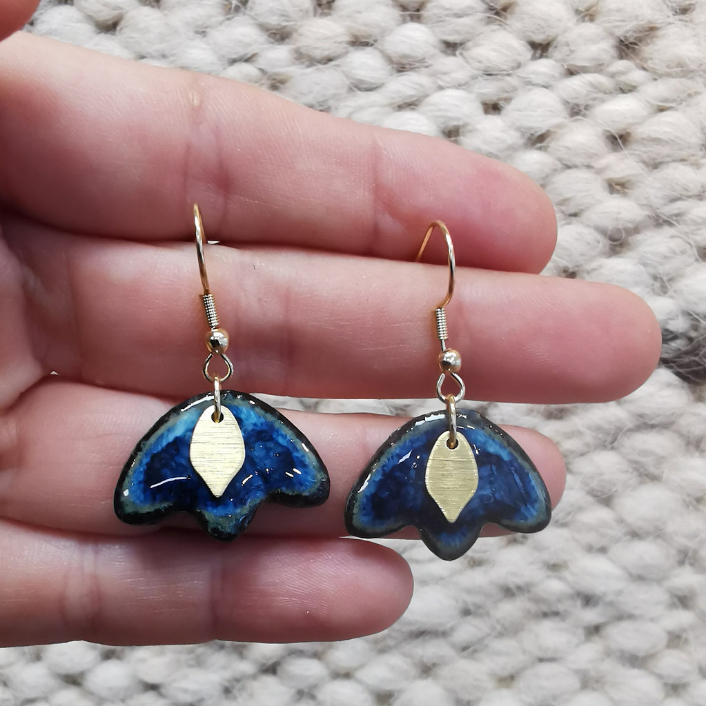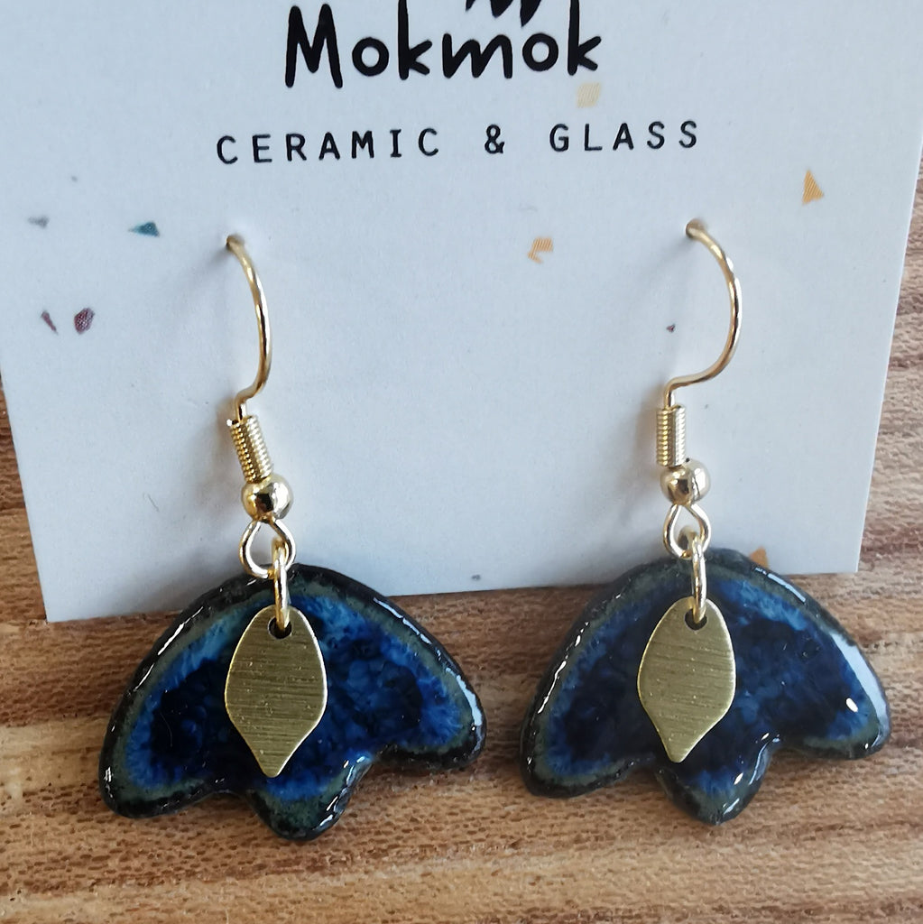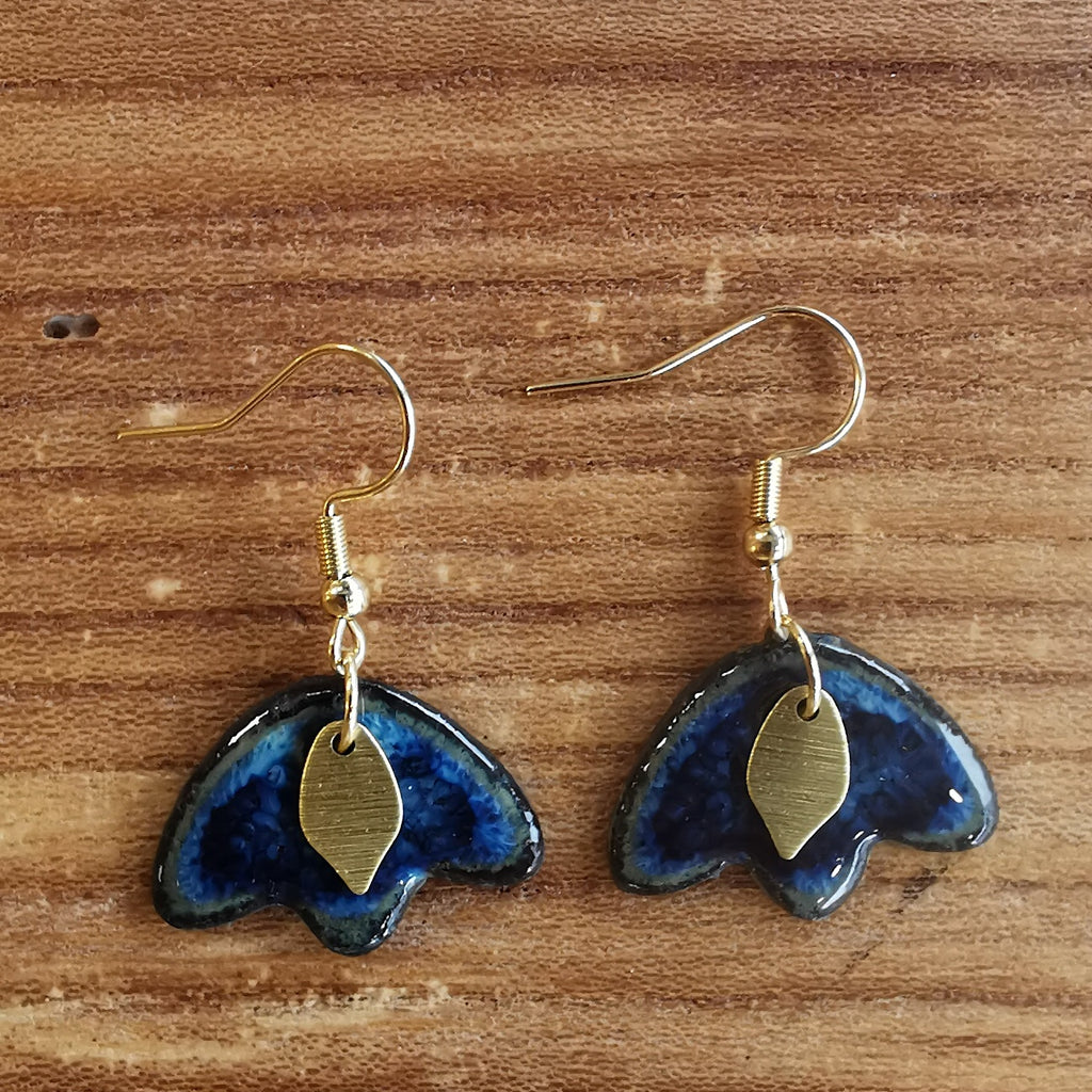 Boucles d'oreilles crochets courts plaqués or 18k, pièce en céramique bleue foncée. Pampille en laiton couleur dorée. Chaque pièce est entièrement réalisée à la main.